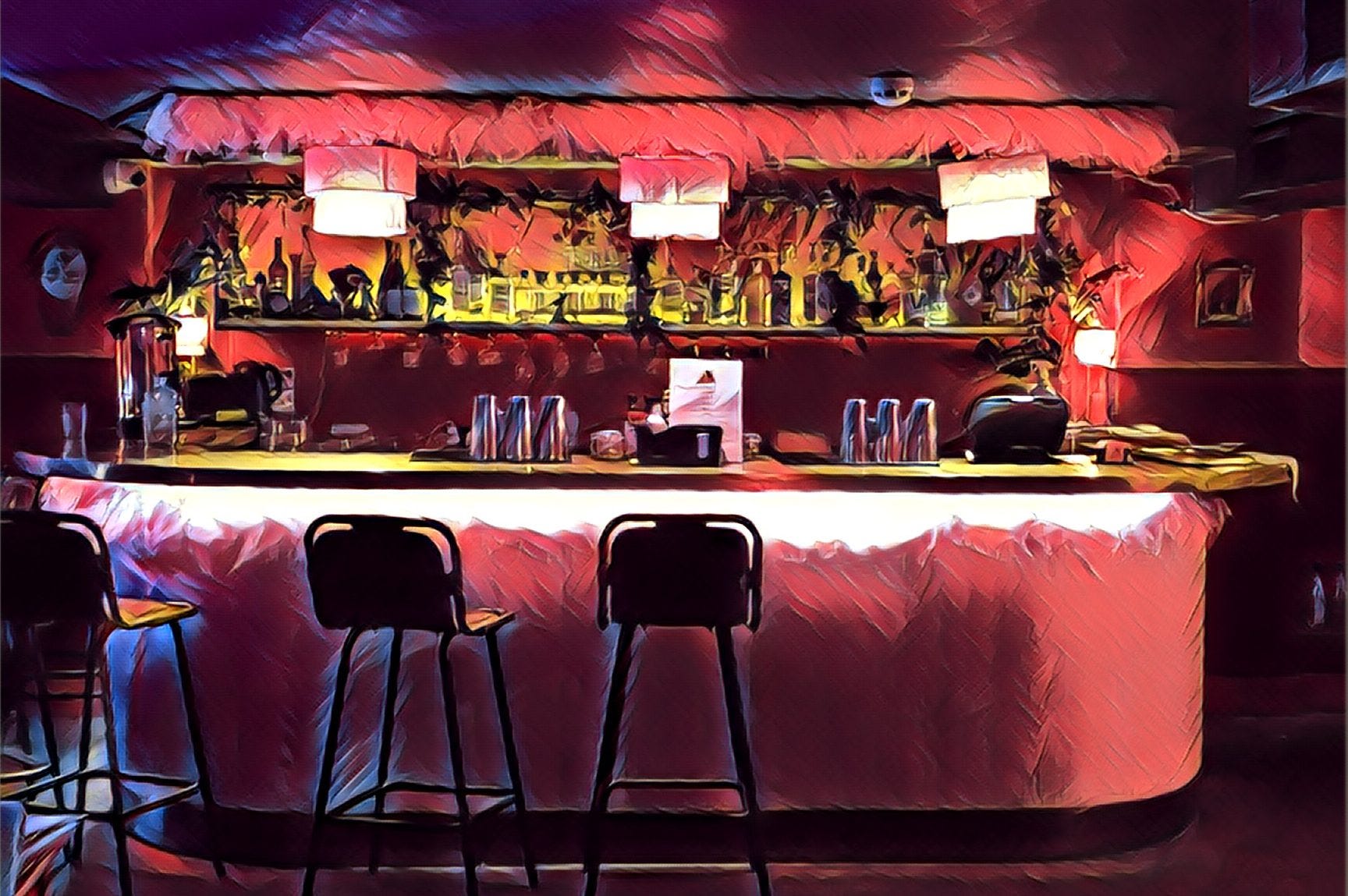 The pink floral canopy stands proud against the pale blue tiled shop front. The shimmering strip curtain catches the stale orange streetlights of Stoke Newington and brings a touch of glamour to this space between a chip shop and the supporters club of a Turkish football team. This must be the place. Descending the stairs the colour hits you like a dream exploding in your frontbrain Is this the belly of a whale? A birth canal? Our intrepid couple take a table. Around the corner a life model disrobes. Behind them old school friends discuss which of their classmates are now wastemen, and which are hench. This must be the place. Margaret and Doña arrive at the table. The former a mezcal-led margarita with a salted rim of depth and contrast. The lady of the house slaps you round the face with a handful of ginger, then offers coffee mezcal and lime to take the sting away. It does. Just. The menu just days from changing, our visitors receive some samples of the new list. Sabrina uses habanero to provide some bite and pink peppercorn to enhance the sour template. Monica is a seasonal combination of espresso martini and chocolate liqueur – perhaps it’s time to upgrade the squat bottle of Irish cream this year? The life model switches poses and someone asks for a 6B pencil. Food from the upstairs Tigre Tacos blends the Mexican (chipotle mayo) with the British (beer batter and Bermondsey cheese) while the sharp white cabbage is a world away from the boiled version the neighbouring table may recall from the school cafeteria. Bartender Dario swings by to answer questions on the sustainability of the agave plant and the importance of the relationship the bar team has developed with a range of independent producers. The neighbours posit the attraction of a ten year school reunion. Our visitors finish with a boozy Virginia (mezcal, hibiscus, raspberry sage and rose) hurry for the bus home before the jocks arrive to steal their mezcal money. (92 Stoke Newington High St. www.bardonalondon.com).